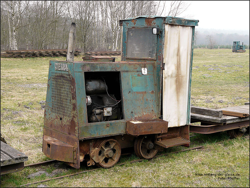 Reserve vorgehalten und bespannt gelegentlich Bauzüge. 6 Nicht viel jünger, aber täglich im Dienst: Diema 1233 von 1948 wartet auf die Übernahme eines Leerzuges zum Abbaugebiet. 7 Außenseiter: Von den vier modernen Schöma CHL-20G, die das Torf- und Humuswerk Gnarrenburg 2011 besaß, war am Besuchstag eine am Standort Hagen. Schöma 6096 ist fast 60 Jahre jünger als ihre Schwestern in Hagen. |