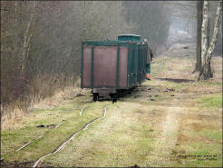 hat acht leere Loren übernommen und verlässt das Torfwerk über