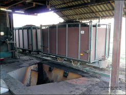 9 Im Werk Hagen wird der gewonnene Torf nur noch auf Lkw umgeladen. Das historische Betriebsgebäude reicht dafür noch aus. 10 Lore 125 auf der hydraulischen Kippe. Der Torf fällt hier direkt auf ein Förderband und von dort auf Lkw. Eine Zwischenlagerung gibt es nicht. |