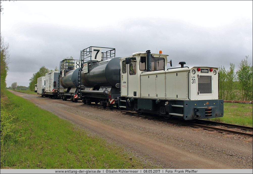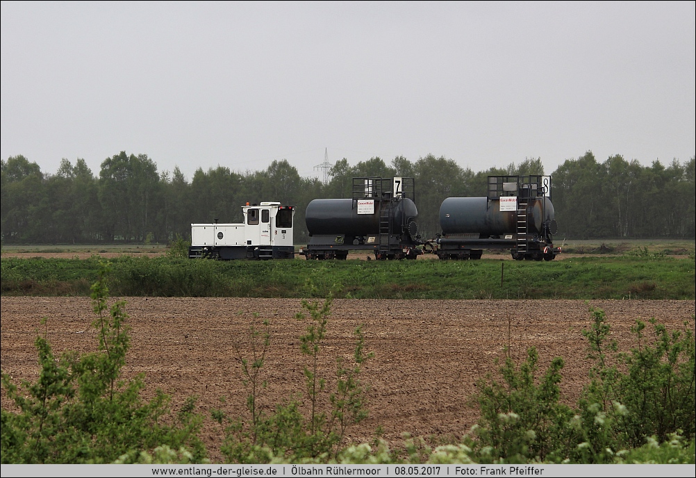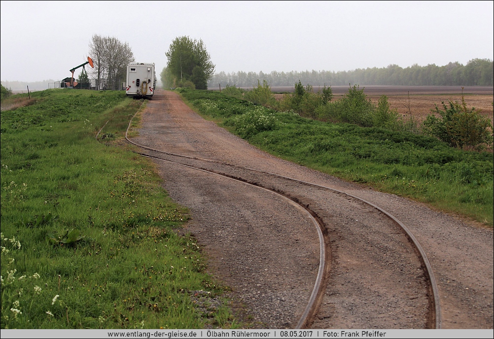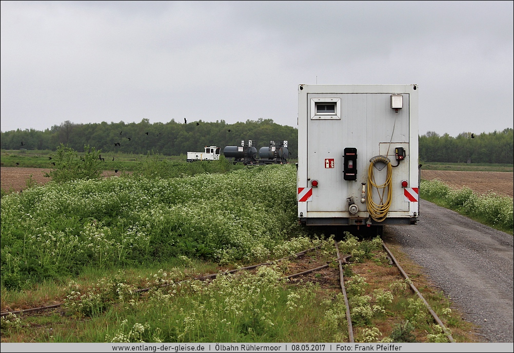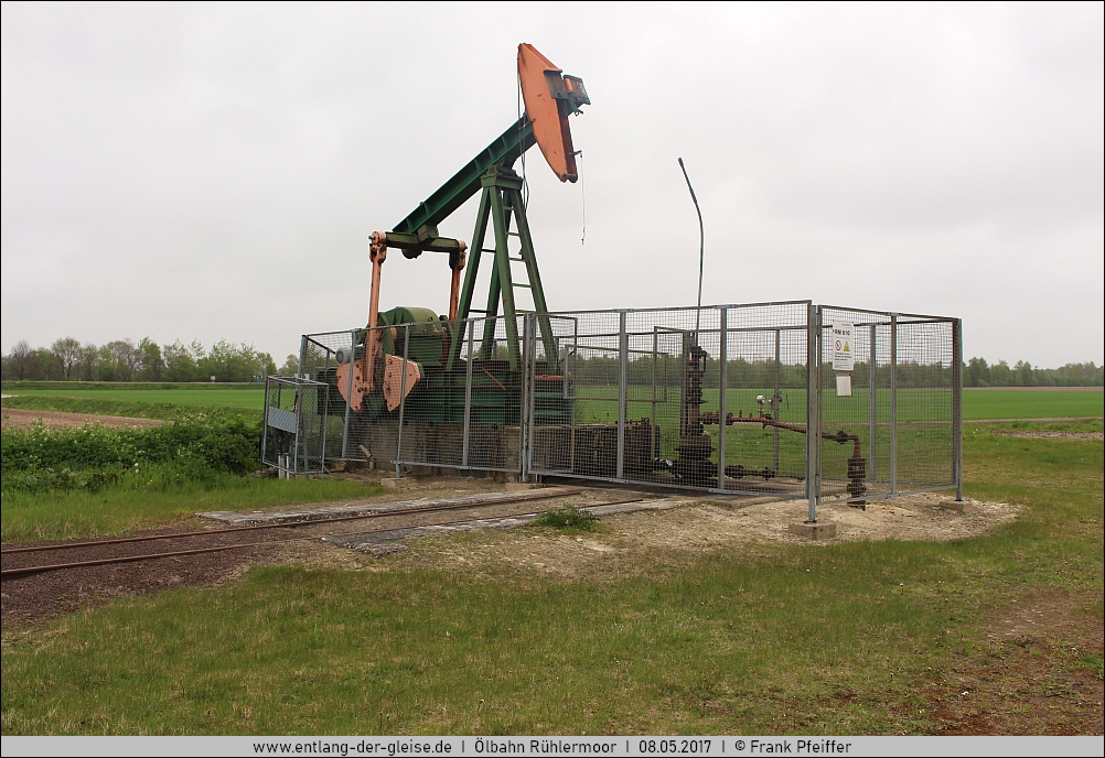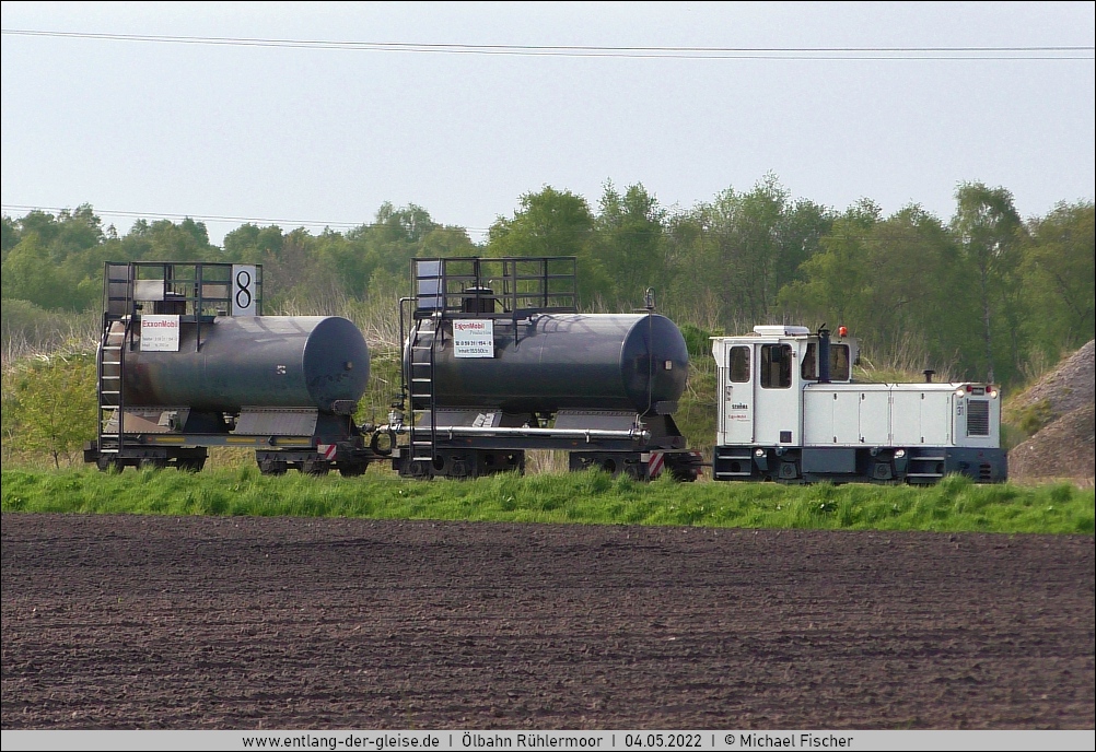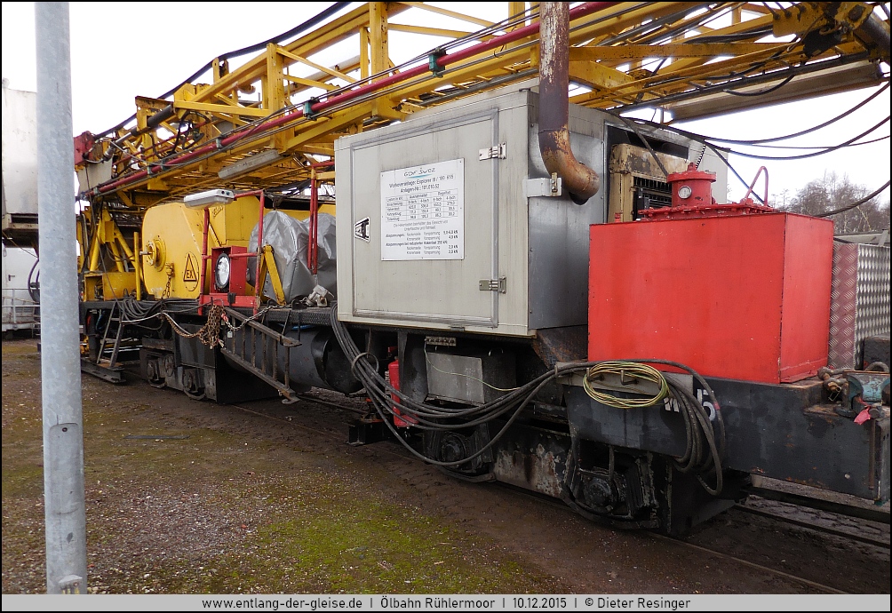 sich unter den Torffeldern dieses Unternehmens. Die Feldbahn wird eingesetzt, weil die weichen Moorböden und die darauf angelegten Schotterwege kein Befahren mit schweren Straßenfahrzeugen zulassen. Daher werden Baumaschinen, Aufenthalts- und Sanitärcontainer, Rohre und ganze Bohrtürme mit der Feldbahn transportiert. Die Kesselwagen transportieren allerdings kein Erdöl, sondern bringen das aufbereitete Lagerstätten-Wasser, das zusammen mit dem Erdöl gefördert wird, nach der Aufbereitung in der Raffinerie zurück in das Ölfeld, wo es wieder verpresst wird. Hinweise: - Alle Wege im Rühlermoor sind für den Kraftfahrzeugverkehr, die meisten seit einigen Jahren auch für Radfahrer und Fußgänger gesperrt. Das Einhalten wird streng kontrolliert. Diese Aufnahmen entstanden entweder von öffentlichen Wegen, mit Genehmigung örtlichen Personals oder wurden bereits vor Jahren aufgenommen, als noch nicht so viele Wege gesperrt waren. - Alle Bilder können durch Anklicken vergrößert werden. |