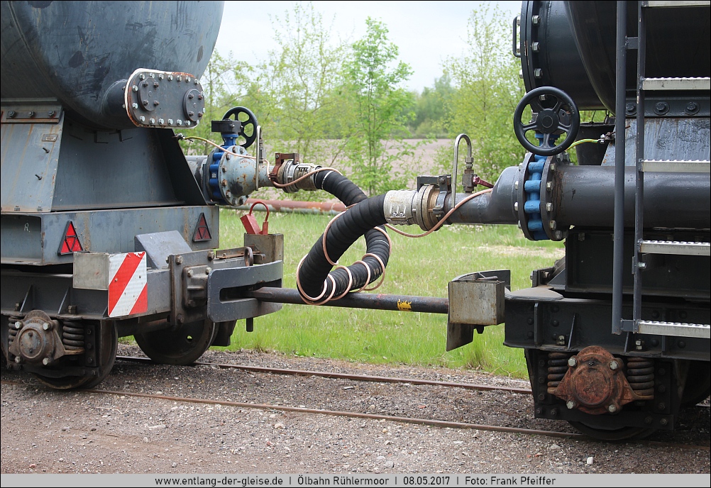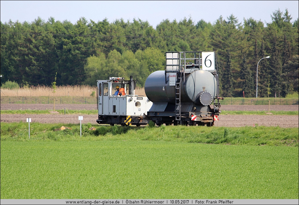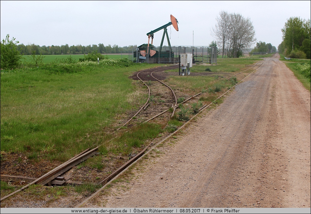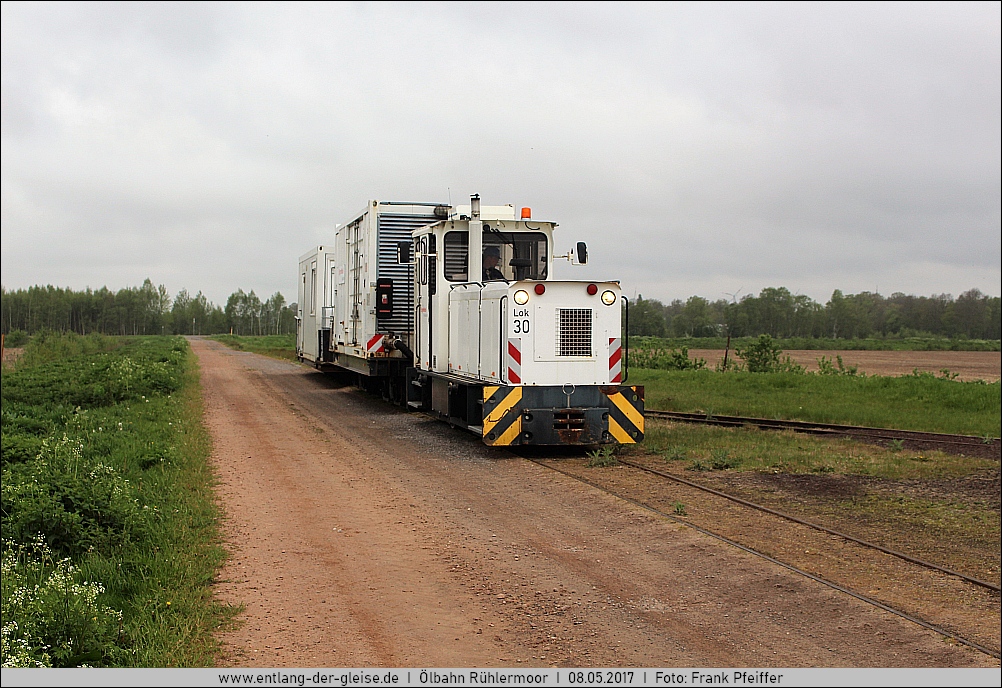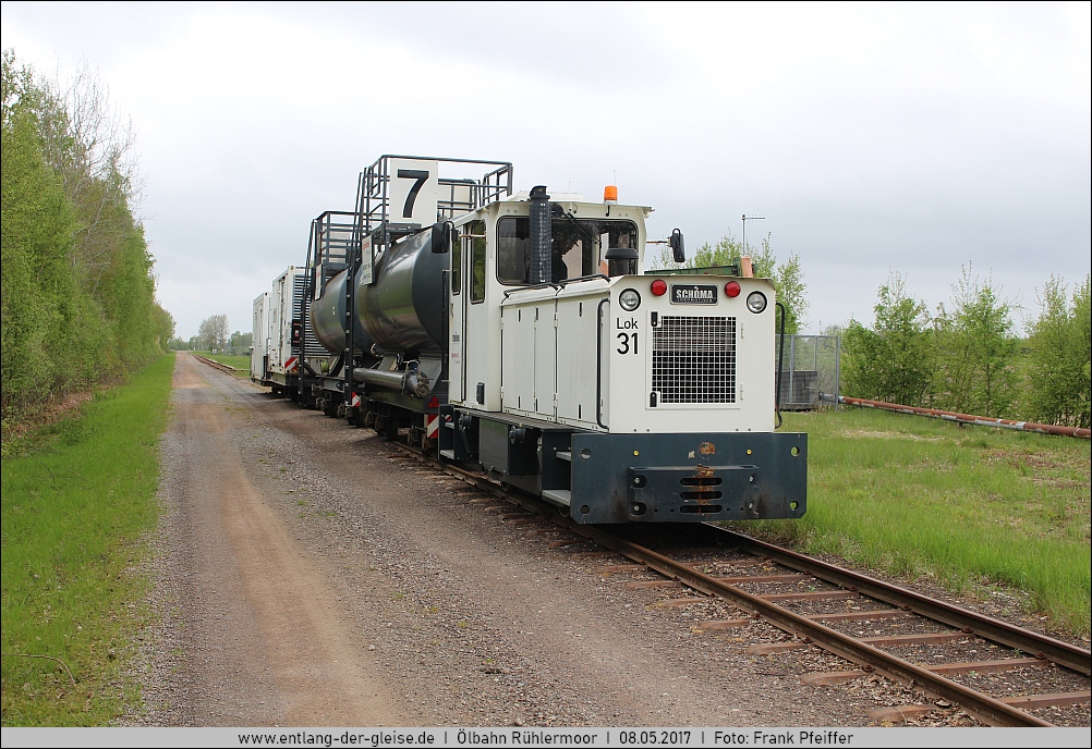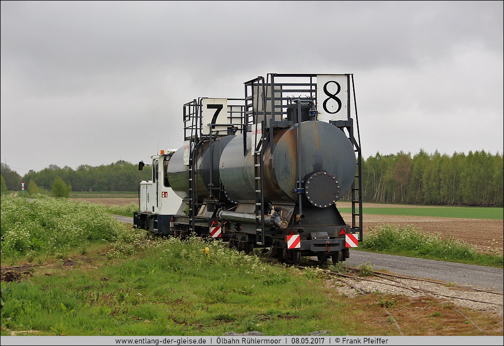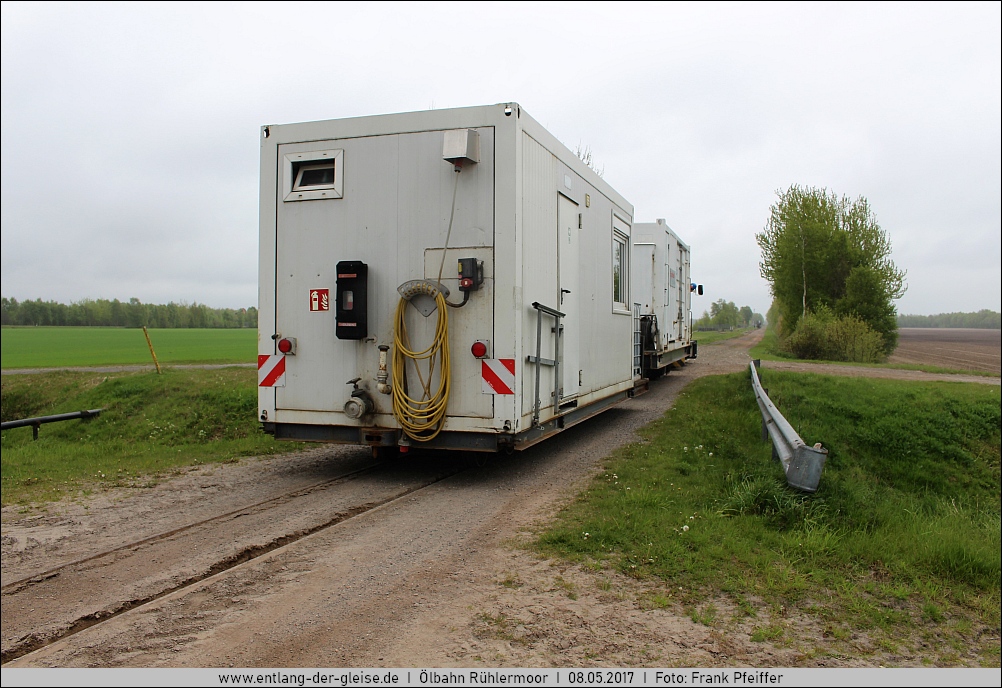 sich unter den Torffeldern dieses Unternehmens. Die Feldbahn wird eingesetzt, weil die weichen Moorböden und die darauf angelegten Schotterwege kein Befahren mit schweren Straßenfahrzeugen zulassen. Daher werden Baumaschinen, Aufenthalts- und Sanitärcontainer, Rohre und ganze Bohrtürme mit der Feldbahn transportiert. Die Kesselwagen transportieren allerdings kein Erdöl, sondern bringen das aufbereitete Lagerstätten-Wasser, das zusammen mit dem Erdöl gefördert wird, nach der Aufbereitung in der Raffinerie zurück in das Ölfeld, wo es wieder verpresst wird. Hinweise: - Alle Wege im Rühlermoor sind für den Kraftfahrzeugverkehr, die meisten seit einigen Jahren auch für Radfahrer und Fußgänger gesperrt. Das Einhalten wird streng kontrolliert. Diese Aufnahmen entstanden entweder von öffentlichen Wegen, mit Genehmigung örtlichen Personals oder wurden bereits vor Jahren aufgenommen, als noch nicht so viele Wege gesperrt waren. - Alle Bilder können durch Anklicken vergrößert werden. |