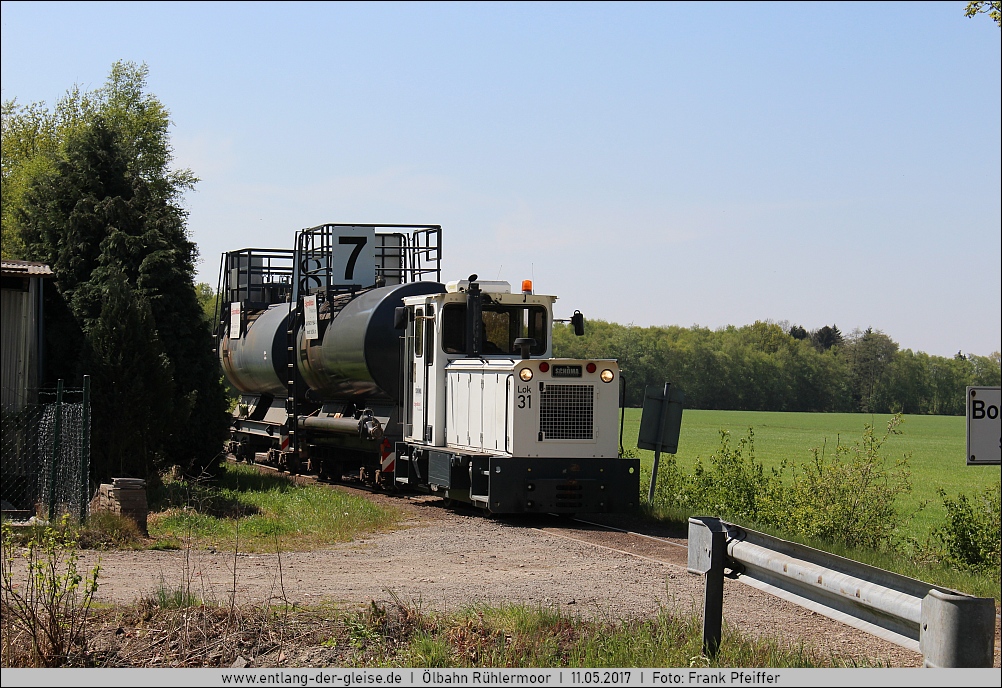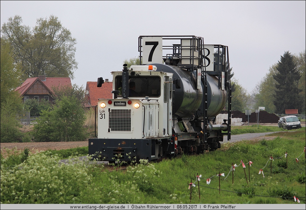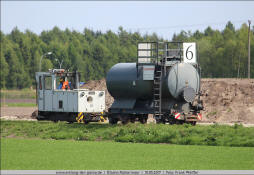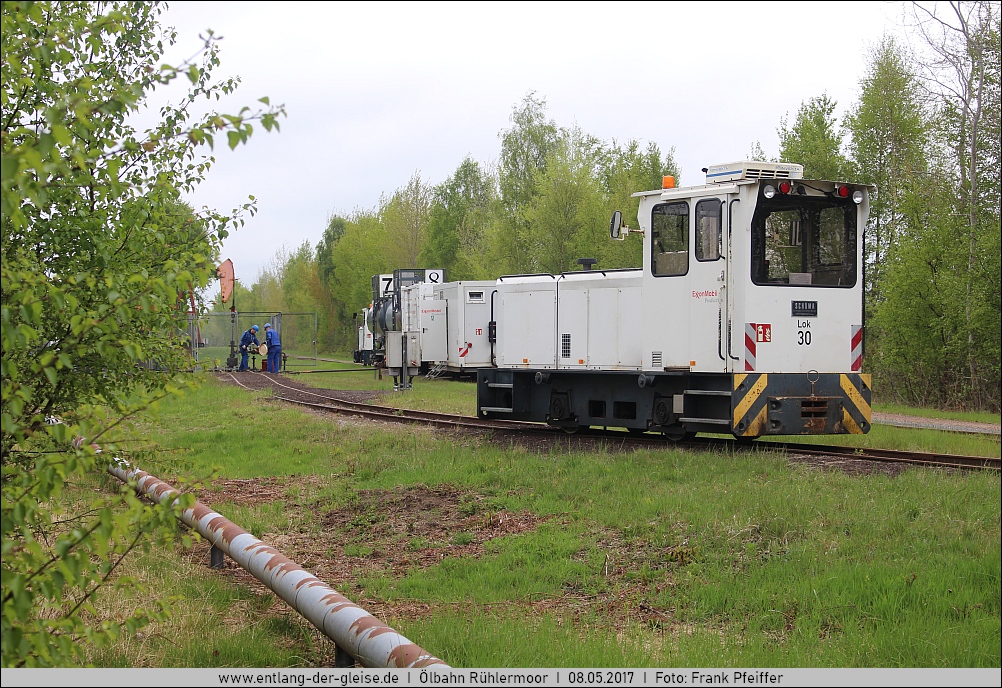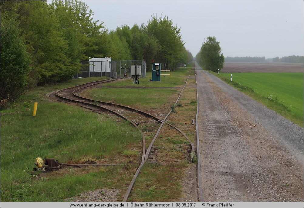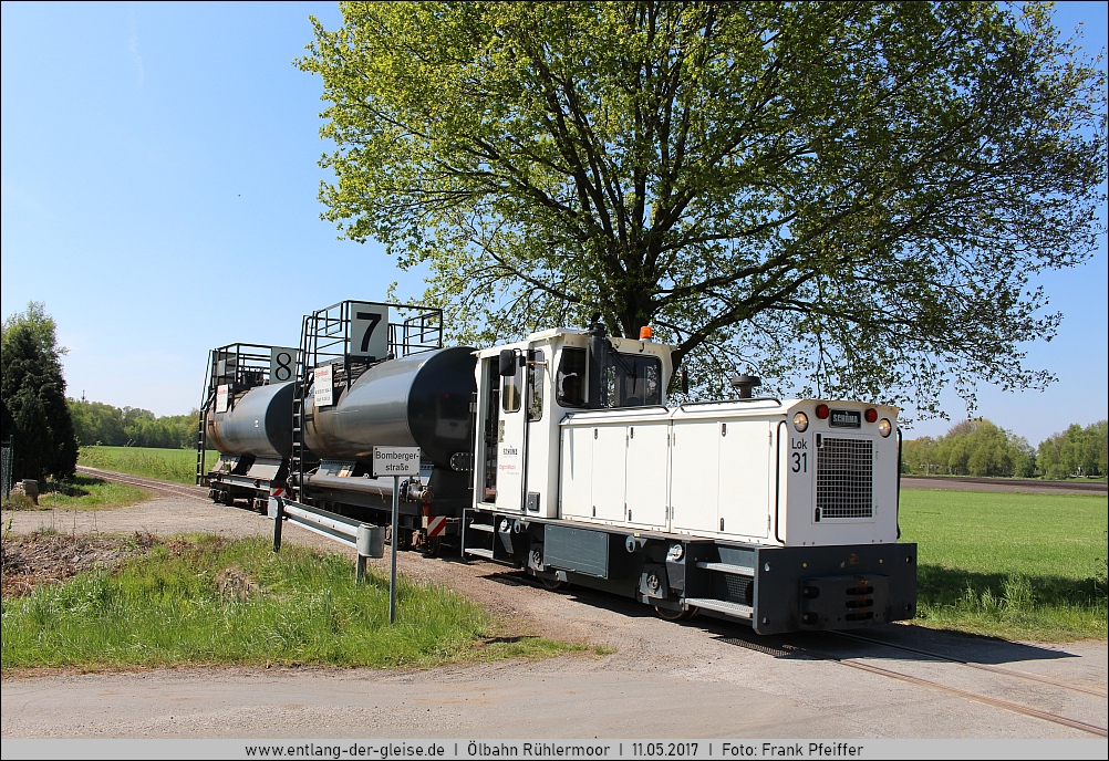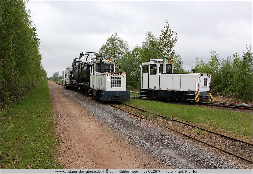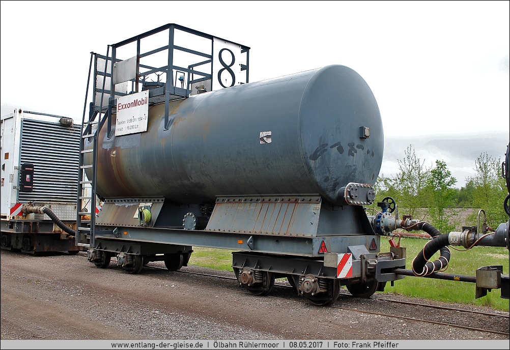 sich unter den Torffeldern dieses Unternehmens. Die Feldbahn wird eingesetzt, weil die weichen Moorböden und die darauf angelegten Schotterwege kein Befahren mit schweren Straßenfahrzeugen zulassen. Daher werden Baumaschinen, Aufenthalts- und Sanitärcontainer, Rohre und ganze Bohrtürme mit der Feldbahn transportiert. Die Kesselwagen transportieren allerdings kein Erdöl, sondern bringen das aufbereitete Lagerstätten-Wasser, das zusammen mit dem Erdöl gefördert wird, nach der Aufbereitung in der Raffinerie zurück in das Ölfeld, wo es wieder verpresst wird. Hinweise: - Alle Wege im Rühlermoor sind für den Kraftfahrzeugverkehr, die meisten seit einigen Jahren auch für Radfahrer und Fußgänger gesperrt. Das Einhalten wird streng kontrolliert. Diese Aufnahmen entstanden entweder von öffentlichen Wegen, mit Genehmigung örtlichen Personals oder wurden bereits vor Jahren aufgenommen, als noch nicht so viele Wege gesperrt waren. - Alle Bilder können durch Anklicken vergrößert werden. |