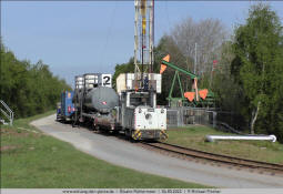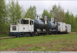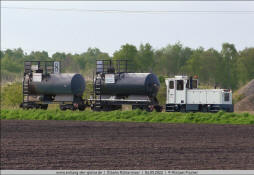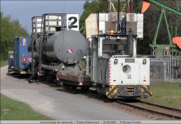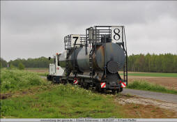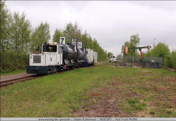 ihren zwei Kesselwagen voller Lagerstätten-Wasser auf dem Weg zum Ziel. 2.2 Ein Nachschuss muss auch sein. 2.3 Im Sichtabstand folgt Lok 30 (Schöma 5774/2003), die den Werkstatt- und Aggregatwagen sowie den Aufenthaltswagen mitbringt. |