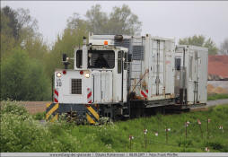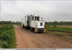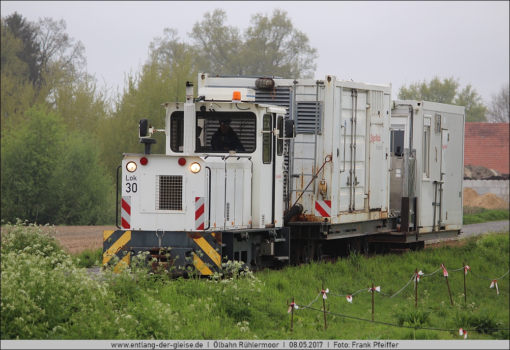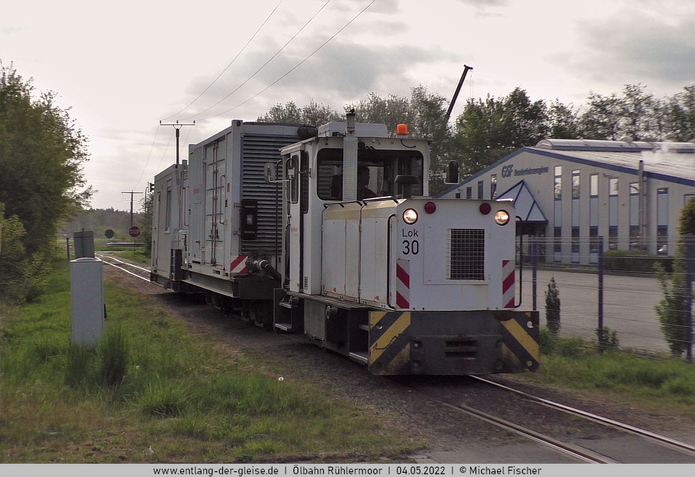 beobachtet werden. 3.2 Bei der Passage des anschließenden Gewerbegebiets ist ein weiterer Blick möglich. Im Sichtabstand folgt dem Zug ein mit Lok 30 (Schöma 5774/2003) bespannter zweiter Zug, der in Containern technische Ausrüstung und einen Aufenthaltsraum ins Ölfeld bringt. 3.3 Ein genauerer Blick auf den mit Lok 30 bespannten Zug. |