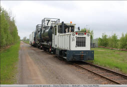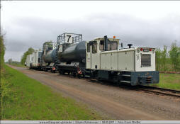 gefahren. 2.11 Lok 31 rangiert zurück und die beiden Flachwagen mit den Containern werden an die Kesselwagen gekuppelt. Das ermöglicht es, beide Loks auf ein Bild zu bekommen. 2.12 Je nach Perspektive wirken die Schöma CHL-60 G Maschinen gar nicht wie Feldbahnloks. |