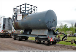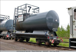 der Rückzug angetreten. Zunächst nochmal ein Bild des Zuges. 2.17 Die Typenaufnahme von Kesselwagen 7, der für den Transport des gereinigten und erwärmten Lagerstätten-Wassers von der Raffinerie zurück in die Förderstätten genutzt wird. 2.18 Kesselwagen 8 ist etwas mehr vom Betrieb gezeichnet, erfüllt aber die selben Aufgaben wie sein Kollege. |