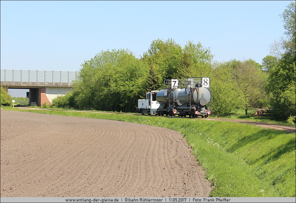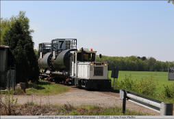 mit ihren zwei leeren Kesselwagen die Straße An der Werkbahn. 2.30 Mit einem Nachschuss auf diesen Zug, der gleich die Autobahn 31 unterqueren wird, endet der erlebnisreiche Besuch bei der Erdölbahn im Rühlermoor. |