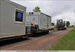 sind. 2.8 Der zweite Zug kann nach einem Sprint zu Fuß wieder eingeholt werden, so dass eine Aufnahme von vorn möglich ist. 2.9 Wenig später überquert er den Schmeesgraben, wofür das Gleis mittig auf den Fahrweg verschwenkt wird. |