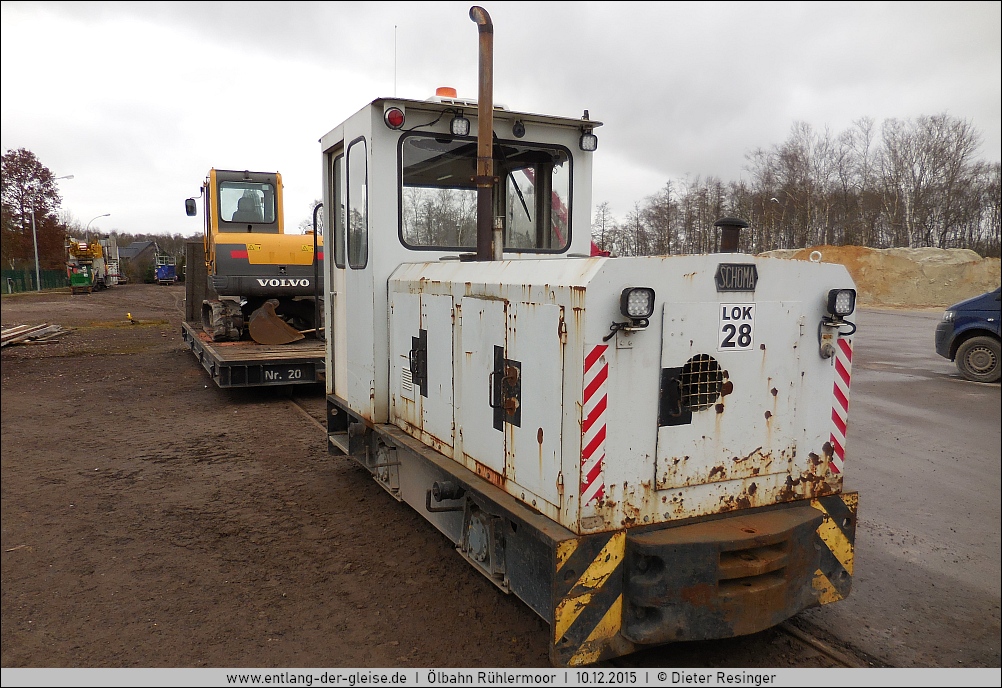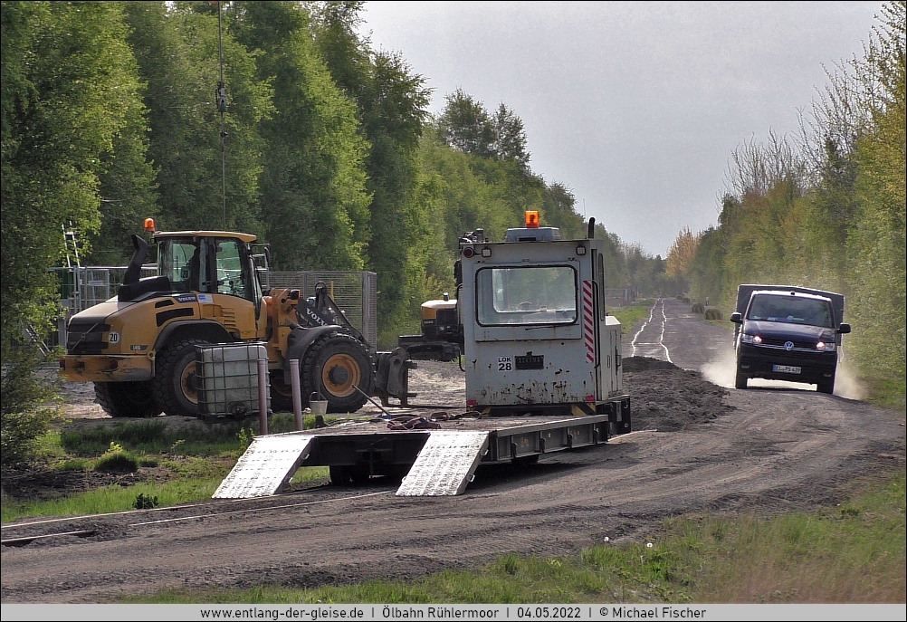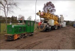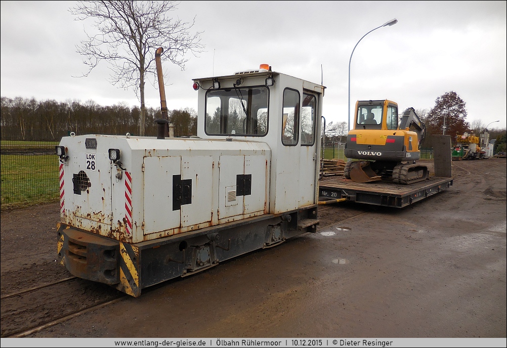 6583/2012) ist mit Flach-, Kessel- und Containerwagen vor Ort. 3.6 Die Ölbahn verfügt über verschiedenste Wagen, um im Ölfeld des Rühlermoors effektives Arbeiten zu ermöglichen. Hier ist ein Tieflader hinter Lok 28 (Schöma 5377/1993) zu sehen, der schwere Baumaschinen zu den Einsatzstellen bringt. Sie könnten auf den wenig tragfähigen Wegen im Moor nicht fahren. |