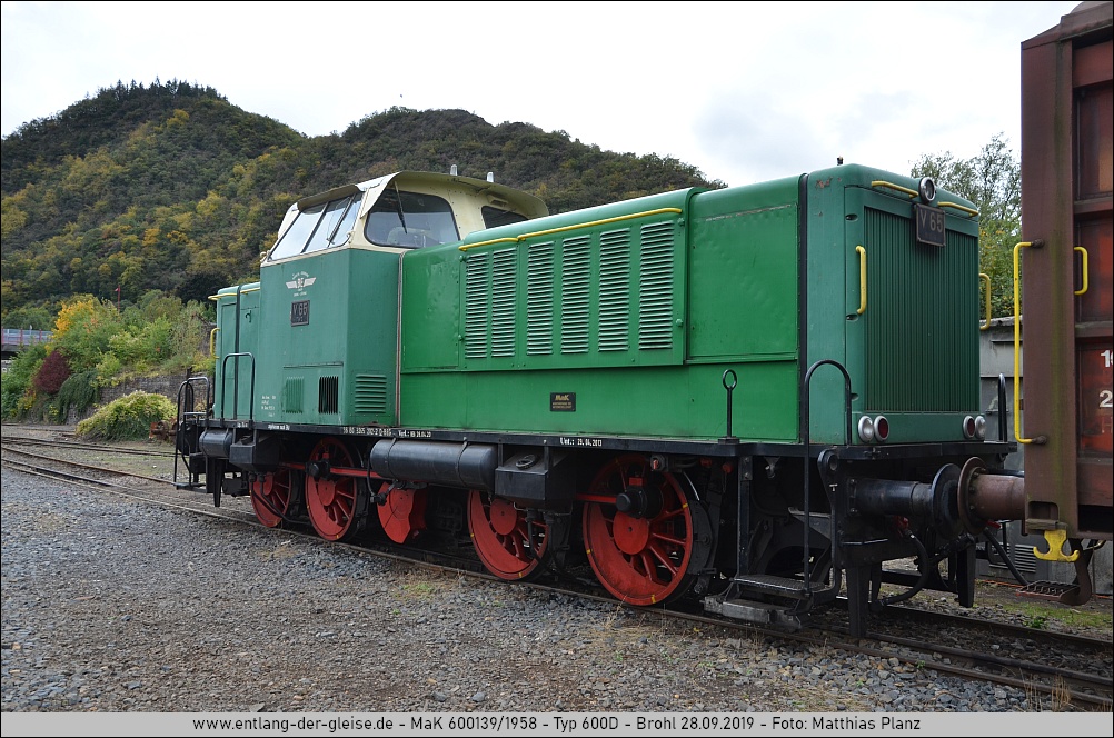 56656 Brohl-Lützig | Hersteller: MaK I Fabrik-Nr.: 600 139/1958 I Typ: 600 D I mehr zur Lok |
