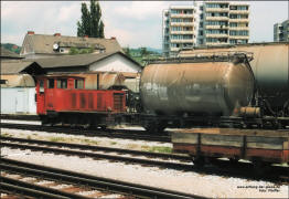 Oberfeistritz gebracht wird. 22 Der vierachsige Flachwagen SSrm 885 hatte in Weiz Teile der jugoslawischen Diesellok 740 106 geladen. Die Lok kam bereits ohne Führerhaus in der Steiermark an; ein Umbau und Inbetriebnahme fanden schließlich nicht mehr statt und die Bauteile dienten als Ersatzteilspender für die Loks VL 22 und VL 23 der StLb. 23 Vierachsige Schmalspurkesselwagen dieser Ausmaße dürften sehr selten sein. Der von der StLb selbst gebaute EEzm 781 wurde in Weiz fotografiert. Insgesamt verügt die Bahn über zwei dieser Wagen. |