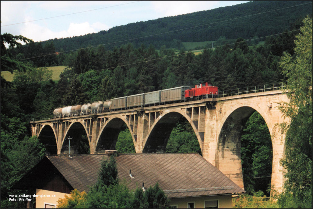 m lange und bis zu 31 m hohe Bauwerk ausleuchtet. 8 Die Jacke hat ein Gleisbauarbeiter wohl vergessen, als er an diesem schwülheißen Tag zur Mittagspause aufgebrochen ist. VL 15 rollt über die ausgebesserte Trasse nach Oberfeistritz. 9 Auch der Bauer hat die Arbeit nicht zu Ende gebracht: Nur ein Teil der Wiese ist gemäht, als VL 15 am Hang entlang bei Peesen fährt. |