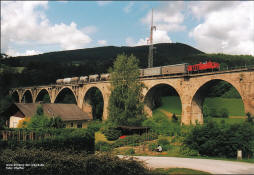 auf frisch ausgebessrten Gleisen zurück nach Weiz. 11 Am Stadtrand von Weiz kann der Zug erneut angetroffen werden. Acht Wagen galt es zu befördern. 12 Größtes Kunstbauwerk ist der Grub-Viadukt bei Hart-Peesen. VL 15 passiert ihn mit 10 Wagen auf der Fahrt nach Oberfeistritz. Selbst die Frau im Gemüsegarten riskiert einen Blick. |